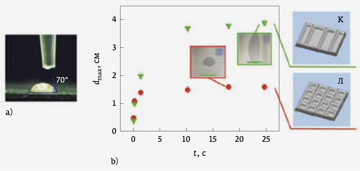 Рис. 2. Результаты исследования смачиваемости поверхности титановых дентальных имплантатов: а) до лазерной обработки (угол смачивания 70°); b) кинетика смачивания dmax (см) во времени t (с) поверхности К‐ и Л‐структур (цена деления масштабной шкалы 2 см)