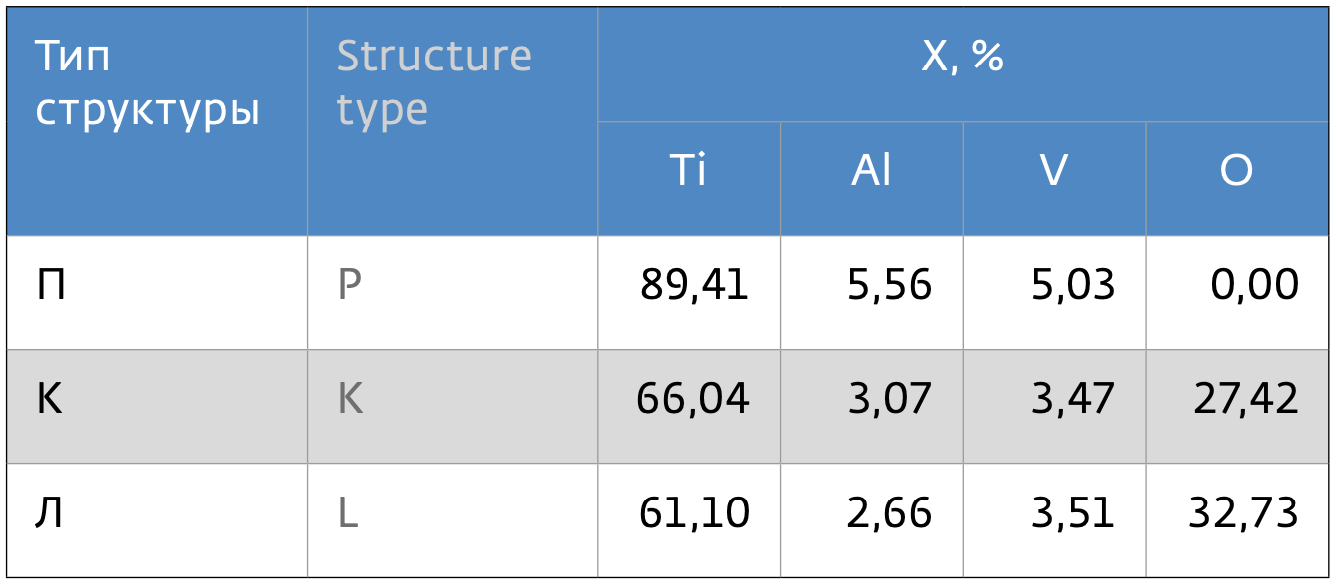 Энергодисперсионный анализ показал наличие кислорода на структурированных поверхностях (табл. 1). Это свидетельствует о наличии оксида титана на поверхности имплантата Специ- алистам известно, что он также обладает хорошей биосовместимостью.