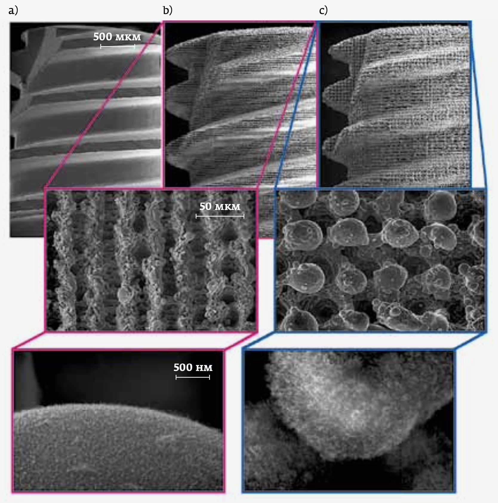 Мы также считаем, что методы на основе лазерного воздействия наиболее перспективны для создания биосовместимой поверхности имплантата. Неоспоримым достоинством лазерной обработки является то, что рельеф поверхности формируется за счет испарения самого материла, без использования сторонних материалов для обработки, таких как корундовые частицы Al2O3, и химических реагентов, например, кислот HCl и H2SO4, что снижает риск отторжения имплантата из-за остаточных загрязнений. Кроме того, лазерная обработка открывает большие возможности для получения сложной многоуровневой морфологии поверхности с заданным химическим составом.