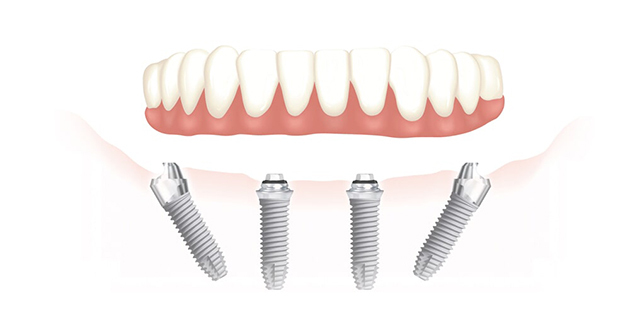 Имплантаты располагаются в строго определённых индивидуальных местах под нужным углом. Два из них устанавливаются во фронтальном отделе челюсти вертикально, два других имплантата устанавливаются в боковом отделе челюсти и имеют угол наклона от 17 до 30 градусов.